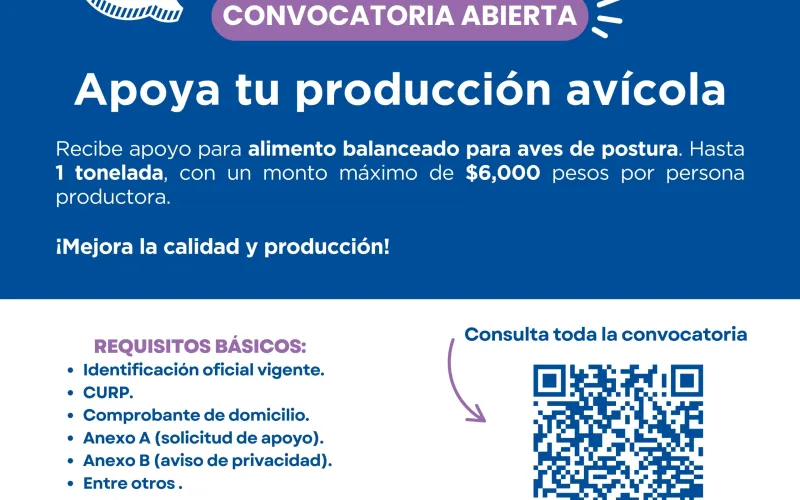 La Secretaría de Desarrollo Rural (SDR) abrió por primera vez la convocatoria para el otorgamiento de apoyo y subsidio de alimento balanceado, dirigido a productores de aves de postura o gallinas ponedoras para la producción de huevos para consumo humano.
