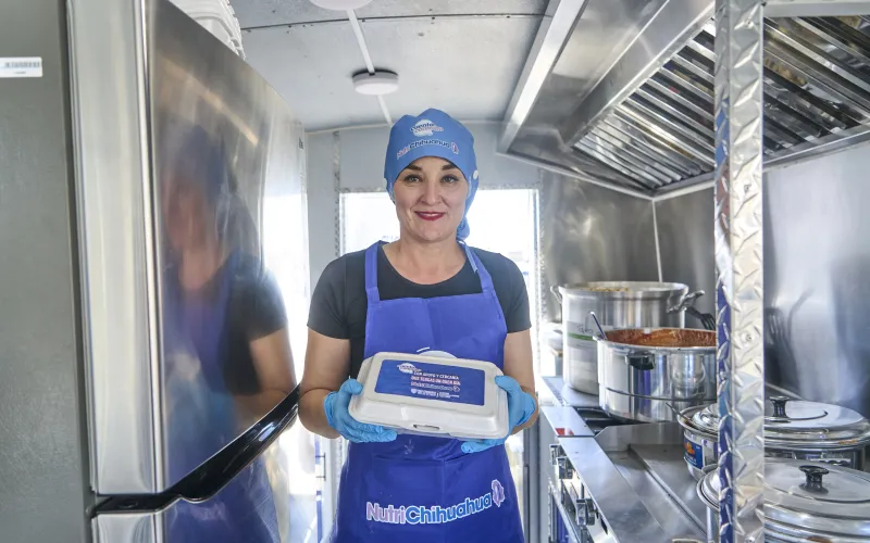 El comedor móvil de NutriChihuahua cuenta con el equipamiento necesario para la preparación y distribución de los platillos, con un menú similar al de los comedores fijos, lo que permite a las y los beneficiarios consumirlos de manera cómoda en su interior.