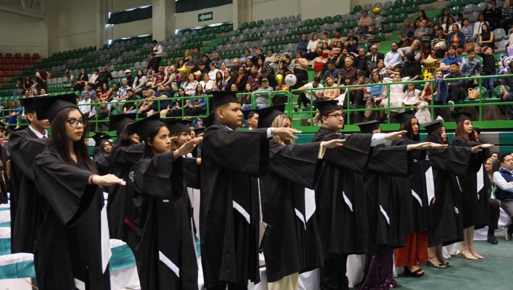 El evento protocolario se realizó en el Gimnasio del Colegio de Bachilleres, ubicado en el Parque Central Poniente, donde 184 graduandos celebraron con familiares y seres queridos la culminación de sus estudios universitarios.